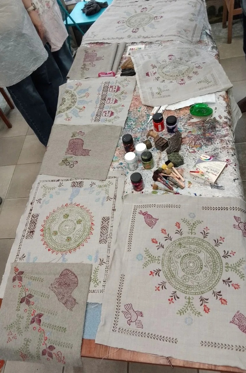 Сегодня на Тарской, 20 состоялся мастер-класс от Елены Николаевны Шнякиной "Салфетка в технике верховой набивки". На фото хорошо виден результат. Участники занимаются набойкой впервые! Учились компановать крупные,затем средние и мелкие рисунки,порабртали акрилом,контурами,кисточкой.